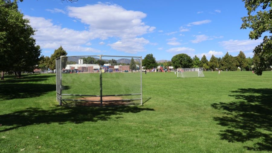 A large field with soccer nets next to a school